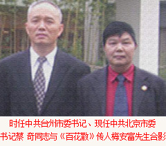 《百花散》傳人梅先生與中共臺州市委書記陳奕君同志合影紀(jì)念2018年7月《百花散》傳人梅先生與中共臺州市委書記陳奕君同志合影紀(jì)念2018年7月      天臺山古代中醫(yī)食療植物方梅氏《百花散》開發(fā)十年以來,已經(jīng)使各類胃腸疾病患者及肝硬化腹水病人數(shù)萬人(包括胃病變、腸病變、食道病變、肝病變患者)恢復(fù)健康,得到廣大患者一致好評,并在康復(fù)患者中發(fā)展了數(shù)百名愛心使者擔(dān)任各地代理,為病痛患者服務(wù)引起社會強(qiáng)烈反響。古代傳世植物食療方《百花散》系列產(chǎn)品對胃病變、腸病變、食道病變、肝病變有神奇康復(fù)效果,已使眾多的重癥患者得到有效食療并康復(fù)。這一消息不脛而走,引起了河南省抗癌協(xié)會、河南省保健品協(xié)會、鄭州市腫瘤康復(fù)協(xié)會相關(guān)專家教授的高度重視,被禪醫(yī)武著稱的少林寺藥局局長釋延琳大法師和中國道教協(xié)會副會長、江西龍虎山天師府張金濤天師稱為中華民族之瑰寶,并得到社會各界人士和媒體關(guān)注。